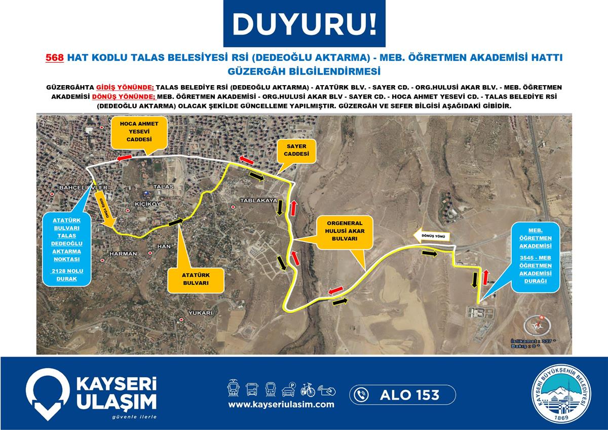 568 HAT KODLU TALAS BELESİYESİ RSİ (DEDEOĞLU AKTARMA) - MEB. ÖĞRETMEN AKADEMİSİ HATTI GÜZERGÂH BİLGİLENDİRMESİ
