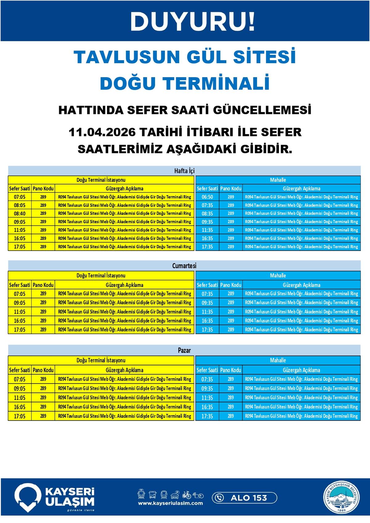 TAVLUSUN GÜL SİTESİ DOĞU TERMİNALİ HATTINDA SEFER SAATİ GÜNCELLEMESİ