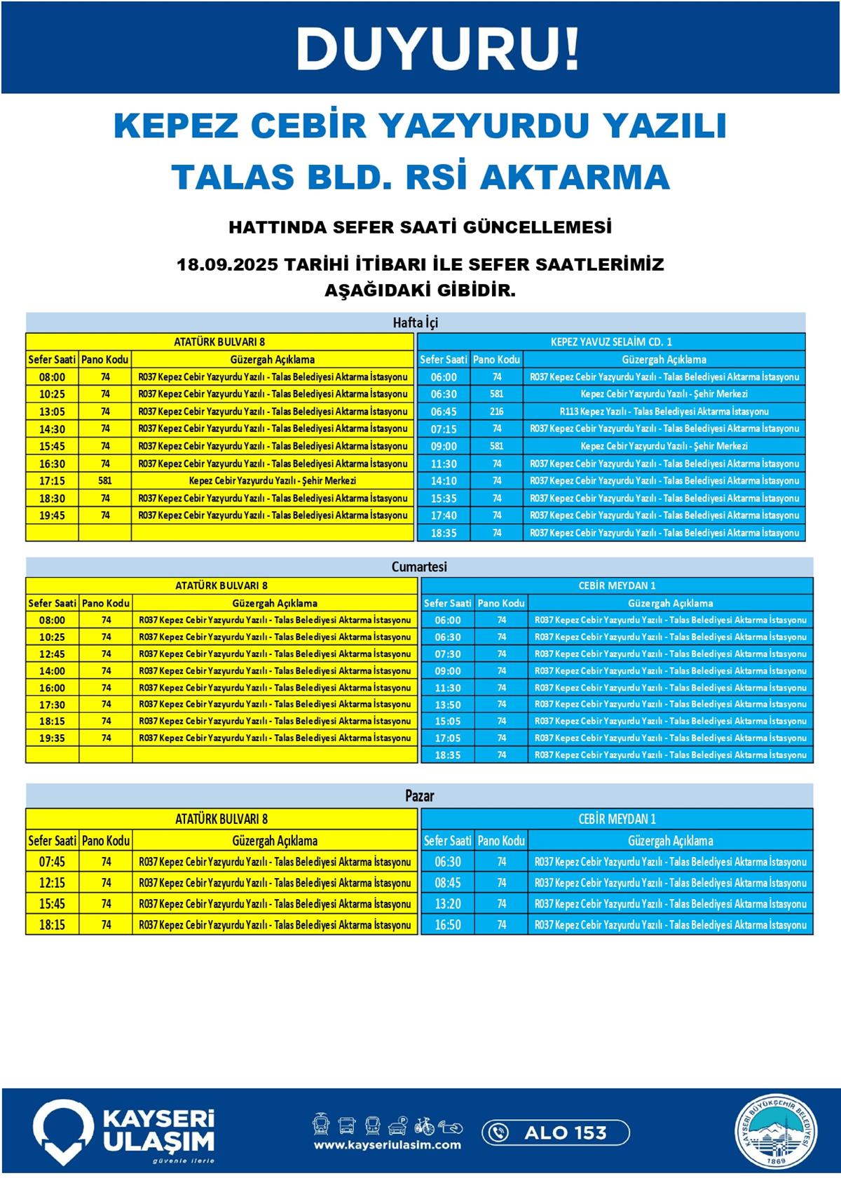 KEPEZ CEBİR YAZYURDU YAZILI TALAS BLD. RSİ AKTARMA HATTINDA SEFER SAATİ GÜNCELLEMESİ