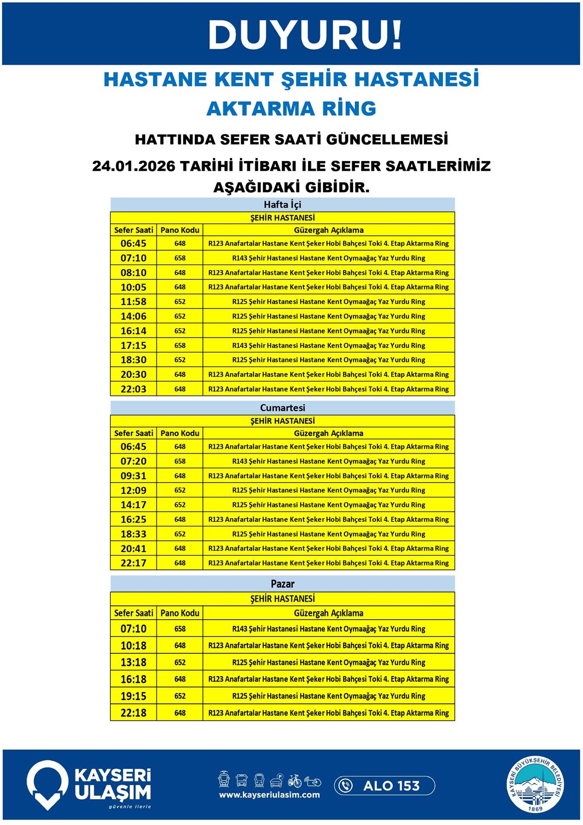 HASTANE KENT ŞEHİR HASTANESİ AKTARMA RİNG HATTINDA SEFER SAATİ GÜNCELLEMESİ