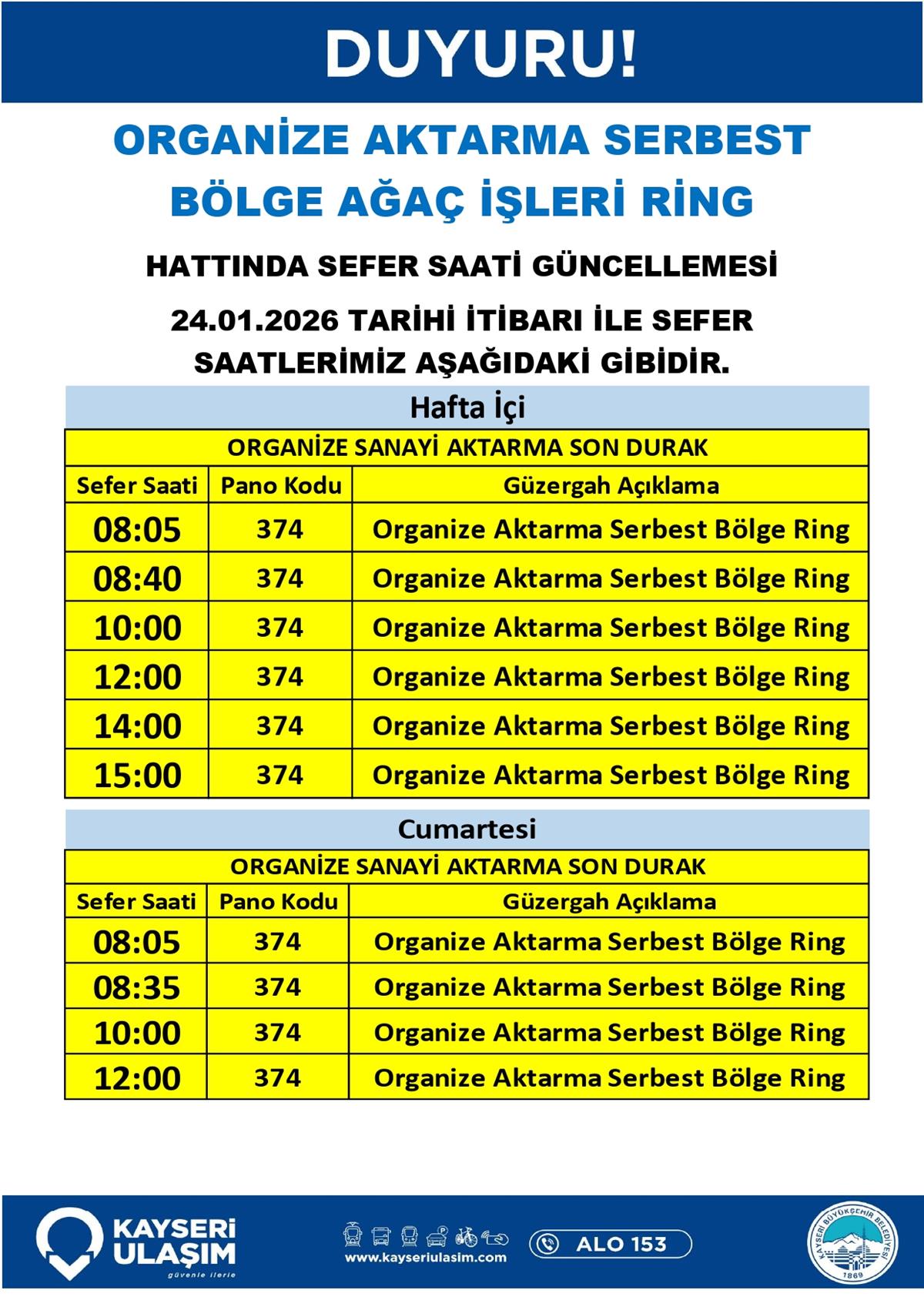 ORGANİZE AKTARMA SERBEST BÖLGE AĞAÇ İŞLERİ RİNG HATTINDA SEFER SAATİ GÜNCELLEMESİ