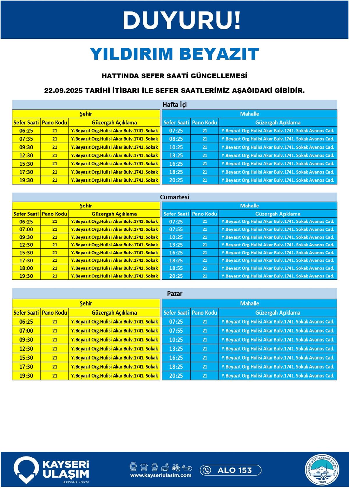 YILDIRIM BEYAZIT HATTINDA SEFER SAATİ GÜNCELLEMESİ