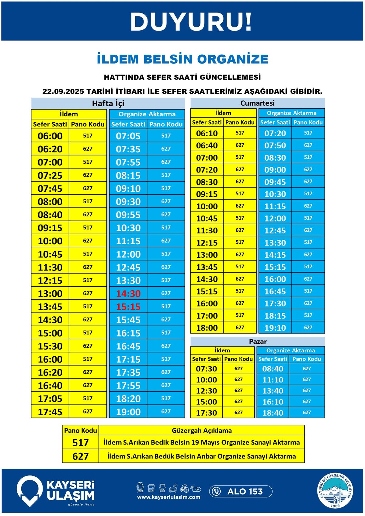 İLDEM BELSİN ORGANİZE HATTINDA SEFER SAATİ GÜNCELLEMESİ