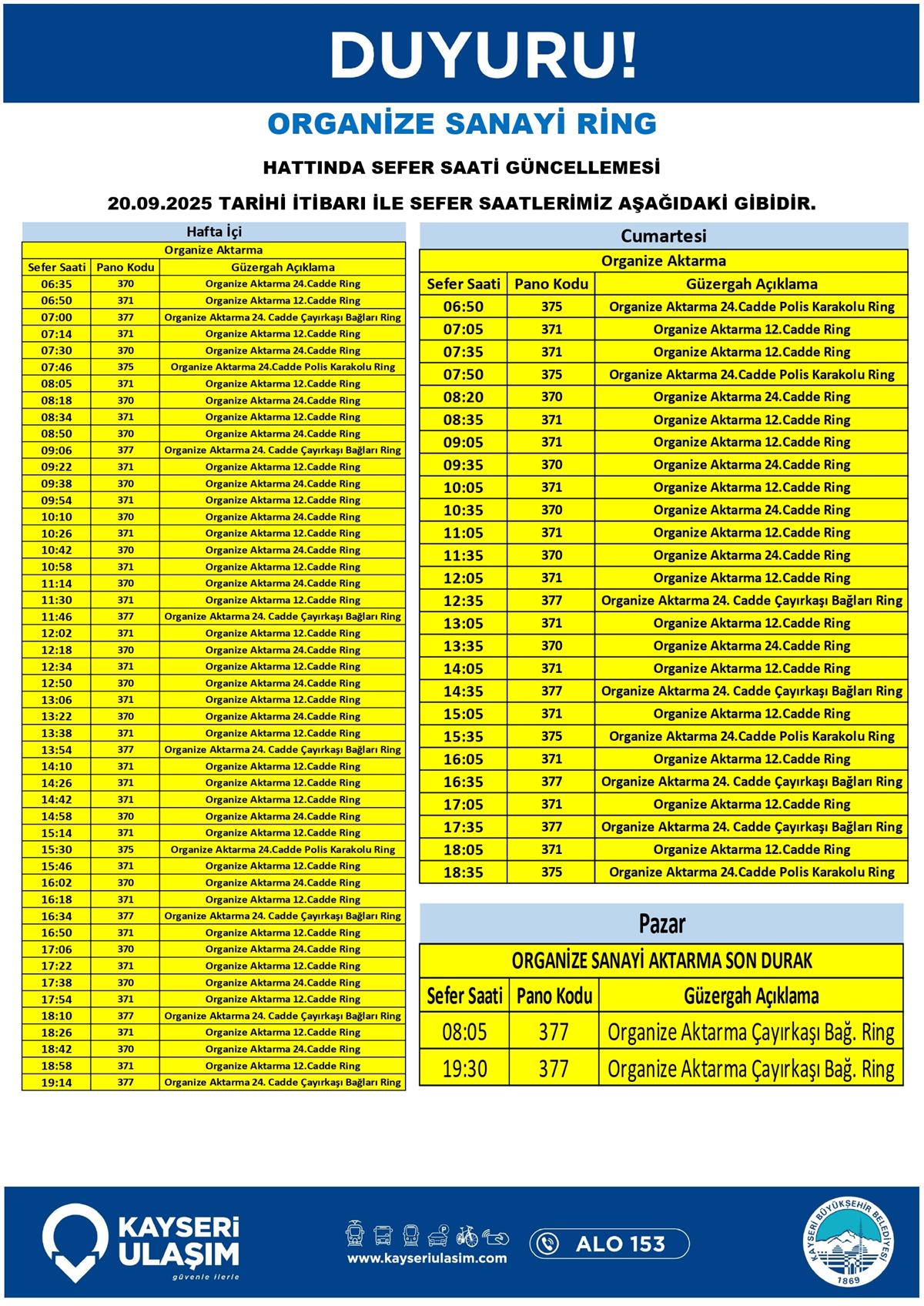 İNCESU - İNCESU ORGANİZE RİNG HATTINDA SEFER SAATİ GÜNCELLEMESİ