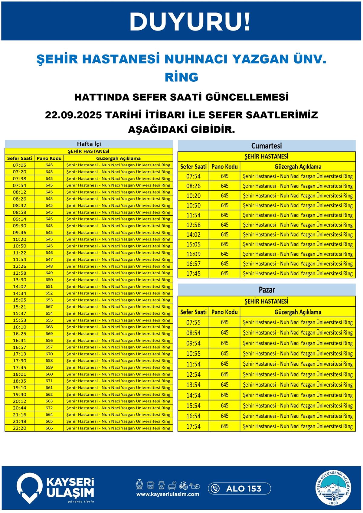 ŞEHİR HASTANESİ NUHNACI YAZGAN ÜNV. RİNG HATTINDA SEFER SAATİ GÜNCELLEMESİ