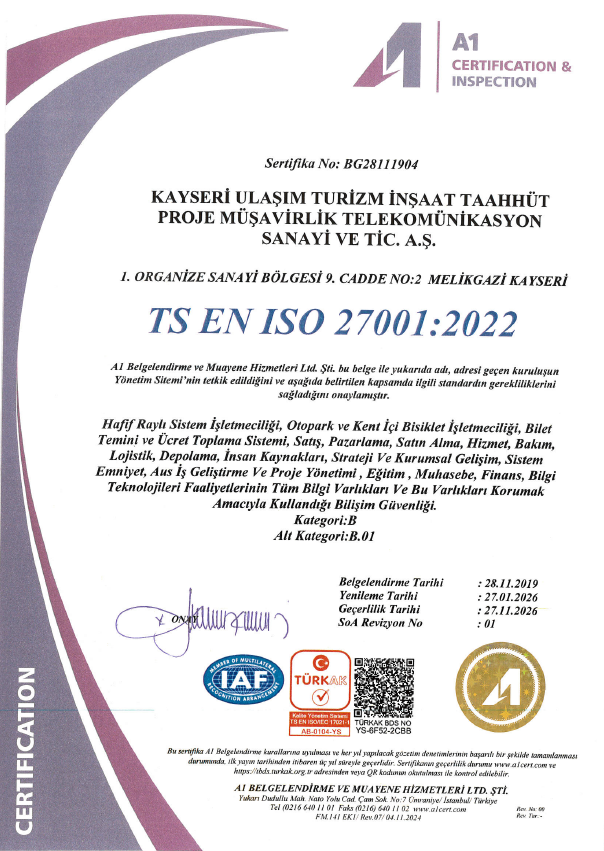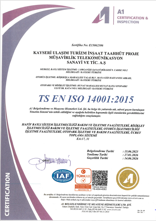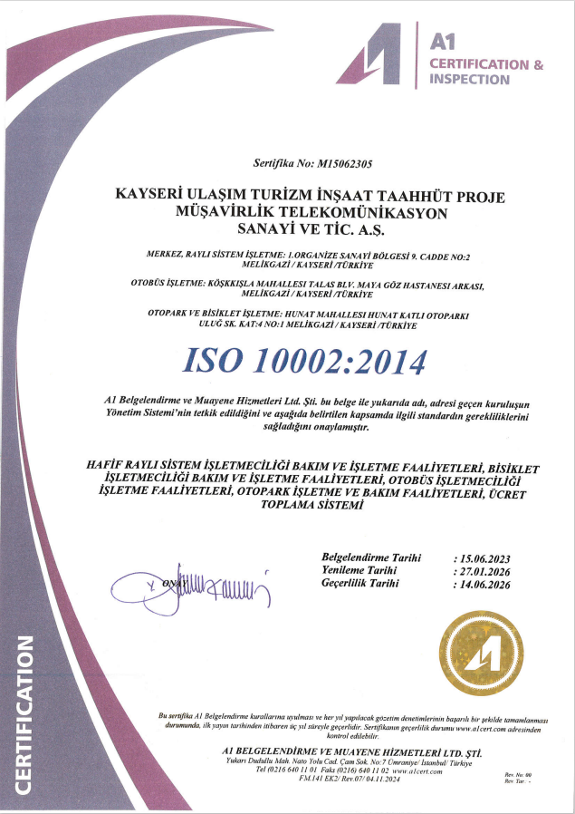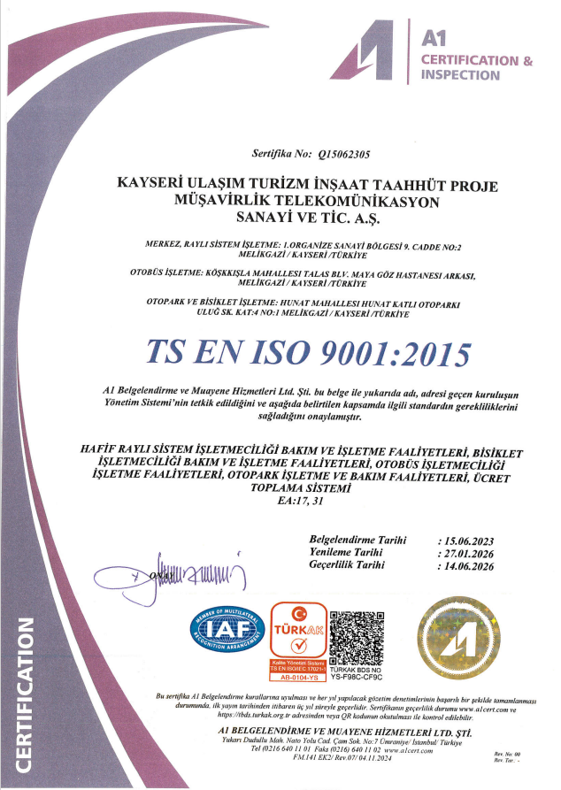 Kayseri Ulaşım A.Ş faaliyetlerini uluslararası standartlara uygun bir şekilde yürütmektedir.